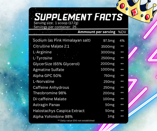 We've devoted significant time and effort to create a unique formula that addresses a demand many have voiced but remained unfulfilled. "Hail the Son" boasts generous quantities of ingredients geared towards enhancing focus. When combined with five stimulants, this pre workout supplement delivers a remarkable blend of energy, heightened focus, and improved mood. To further amplify these essential elements, we've chosen to exclude beta-alanine, a component that can introduce discomfort during workouts. Top that off with five pump ingredients to get you swoled up even beyond your gym session, and two absorption ingredients to make it all come together, and you've got an extreme, exclusive, and a one of a kind pre workout. We here at the King's lab use it daily, and enthusiasts rave about how Hail the Son produces results beyond what the label indicates. #Synergy